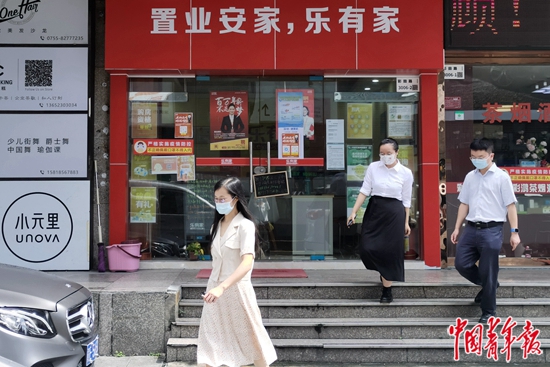 10月14日,幾名年輕人路過位於深圳市福田區彩田路一家房產中介門店。中青報·中青網記者 劉芳/攝