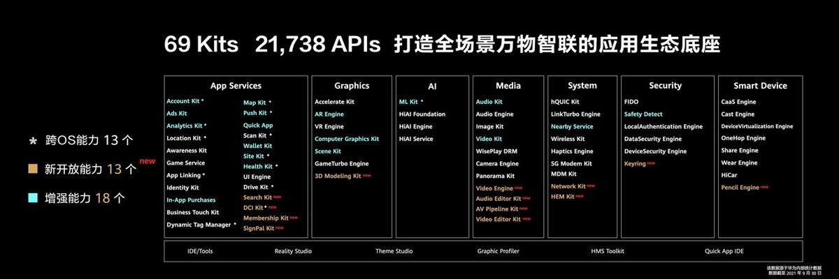 本次大會上,華為消費者業務雲端服務、華為雲CEO張平安在在主題演講中正式發佈全新的HMS Core 6,向全球開發者開放7大領域的69個Kit和21,738個API,包括13個跨操作系統能力,開發者基於不同的操作系統開發應用時,都可以集成華為創新的移動服務能力,保證應用體驗的一致性。華為終端雲服務HMS將進一步把技術、基礎設施、經驗作為服務開放給開發者和夥伴。