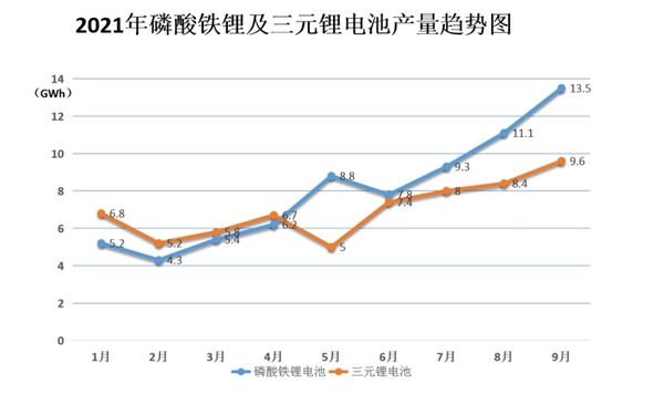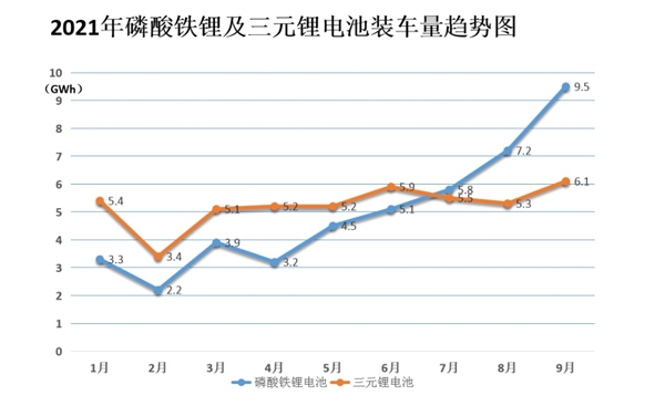 中國汽車動力電池產業創新聯盟發佈的數據顯示,9月我國動力電池產量23.2GWh,其中磷酸鐵鋰電池產量13.5GWh,佔總產量58.3%;三元電池產量9.6GWh,佔總產量41.6%。裝車量15.7GWh,其中磷酸鐵鋰電池裝車9.5GWh;三元電池裝車6.1GWh。自今年 5 月份開始,磷酸鐵鋰電池首先在產量上重新反超三元鋰電池,隨後又於 7 月份在裝車量上超越三元鋰電池;7-9月,磷酸鐵鋰電池在動力電池市場所佔比重也逐月提升,佔比分別為53.8%、56.9%、58.3%;到9月份,磷酸鐵鋰電池的產量已經是三元鋰電池的1.4倍,裝機量是1.6倍,兩者差距還在不斷拉大,呈現出磷酸鐵鋰對三元電池加速替代的趨勢。