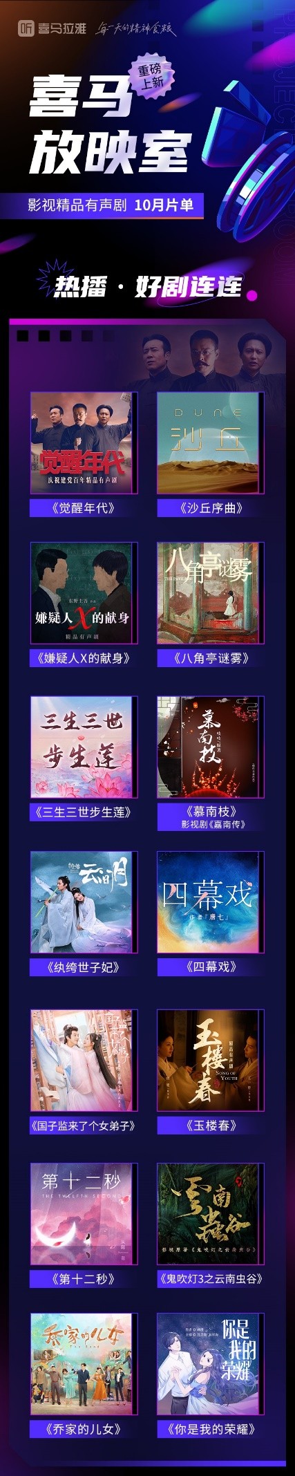近期,《覺醒年代》、《三生三世步生蓮》、《暮光之城》、《沙丘序曲》、《八角亭迷霧》、《犯罪嫌疑人X的獻身》等熱門影視IP的有聲作品紛紛上線喜馬拉雅。喜馬拉雅攜專業配音和製作團隊,通過精湛的配音表演、精細的後期製作、以及讓人身臨其境的聲音效果,讓這些影視IP煥發出全新的活力,為用户打造沉浸式的“聲音劇院”,成為年輕人聽影視IP的新陣地。為此,喜馬拉雅放映室特地推出10月影視片單,幫助影視迷們用聲音追劇。
