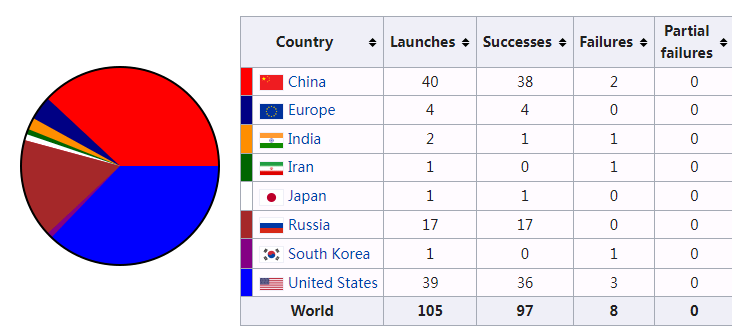 根據相關統計,截至10月27日,全球今年一共進行了105次航天發射。按照國別來計算,中國(40次)排在榜首、美國(39次)緊隨其後,俄羅斯(17次)排在第三。