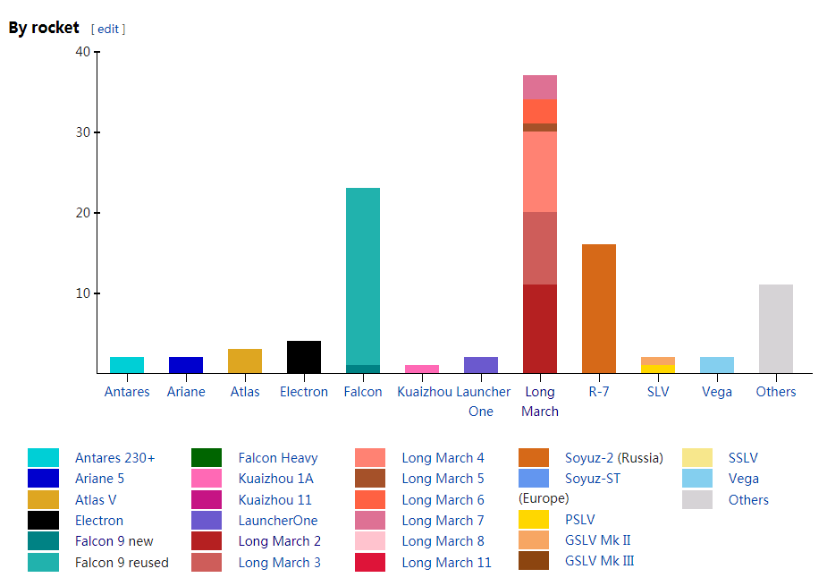 從火箭型號來看,中國長征系列火箭的發射次數最多,達到36次,美國SpaceX公司的“獵鷹9”系列火箭緊隨其後,為23次。但如果從單一型號而言,美國重複使用的“獵鷹9”火箭以22次的發射紀錄居於首位。