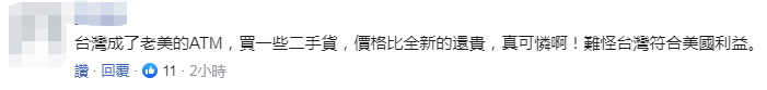 另有網友直言,“台灣成了老美的ATM,買一些二手貨,價格比全新的還貴,真可憐啊!”↓