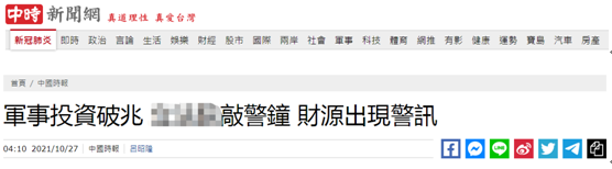 報道稱,雖然台陸委會認為台海風險未升高,但美方仍鼓吹台灣軍事投資必須強化,而根據2022年度防務預算,其中就有11項對外採購案。眾多對外軍購案的付款期程多集中在2027年度前,以2023年度為例,對外軍購案預算需求額度高達612億餘元新台幣,加上對內武器採購,合計高達1119億餘萬元新台幣。台立法機構預算中心稱,高額分年預算需求如未備妥財源,有可能影響未來增列新興投資建案的能量。
