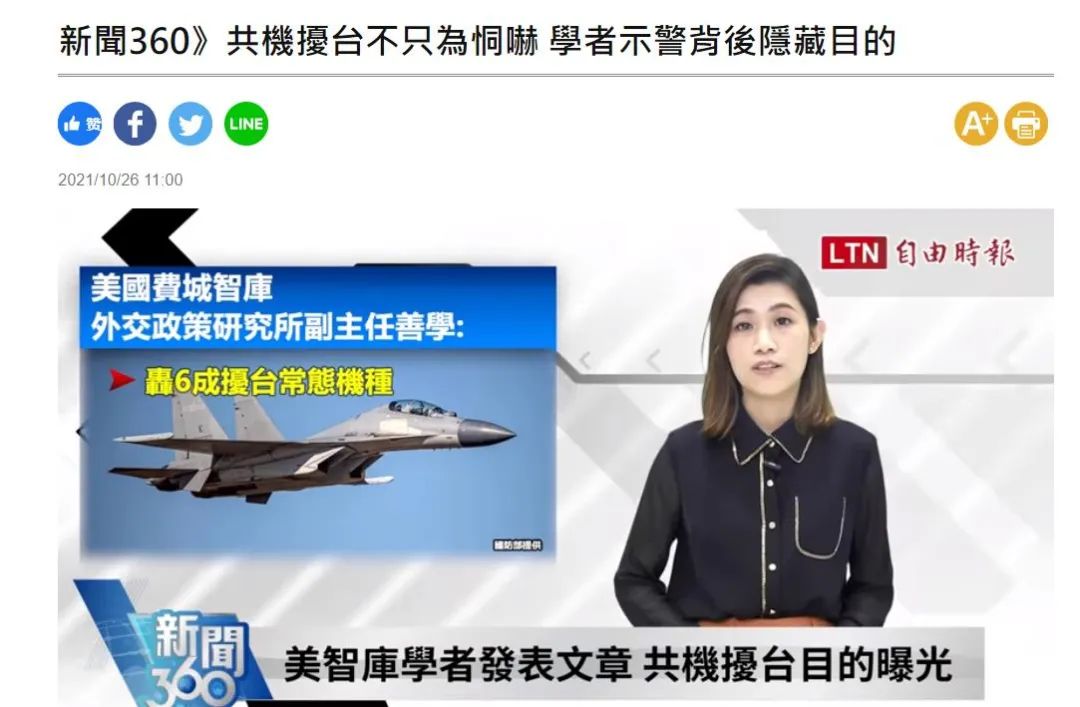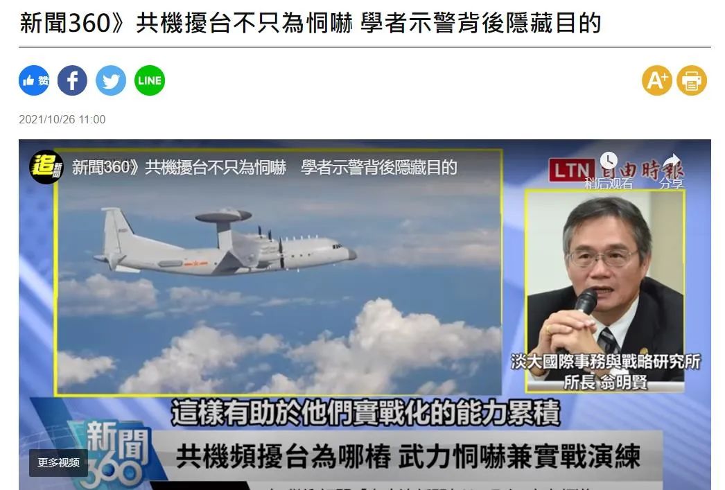 親綠媒體《自由時報》26日一檔名為“新聞360”的節目稱,共軍擾台不只為恫嚇,台學者示警背後隱藏目的。該報道援引美智庫專家的話稱,解放軍可以投放核武器的轟6戰機成為“擾台常態機種”,接下來可能會改為試探巴士海峽等地帶。淡江大學國際事務與戰略研究所所長翁明賢表示,從軍事戰略角度來看,解放軍艦機在進行台海當面戰場和第一島鏈南海戰場的戰場經營,這就需要戰機飛行在相關海空域熟練飛行,瞭解地形地物後,才能和其他機種進行搭配演練。解放軍從2013年以來就一直在做這方面的工作,這樣有利於解放軍實戰化能力的積累。