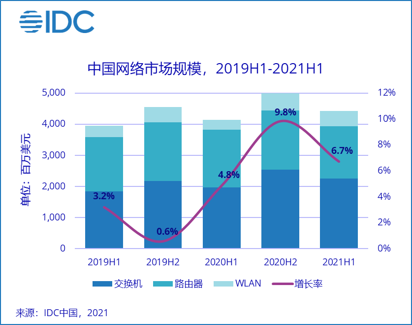 *【環球網科技綜合報道】*10月26日,行業分析機構IDC發佈《2021上半年網絡市場跟蹤報告》。數據顯示,2021上半年中國網絡市場規模為44.2億美元(約合282億元人民幣),與去年同期相比增長6.7%。