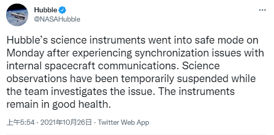 據CNET報道,哈勃太空望遠鏡正面臨着一個新的技術挑戰,這是近年來使這個老化的天文台失去作用的一系列問題中的最新一個。“哈勃的科學儀器在經歷了內部航天器通信的同步問題後,於週一進入了安全模式,” 美國宇航局(NASA)在Twitter上説。“在團隊調查這個問題時,科學觀測已被暫時中止。這些儀器仍然處於良好的健康狀態。”