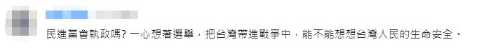 有網友無奈,“禍福無門惟人自招,台灣要被害死了。”“民進黨會執政嗎?一心想着選舉,把台灣帶進戰爭中,能不能想想台灣人民的生命安全。”