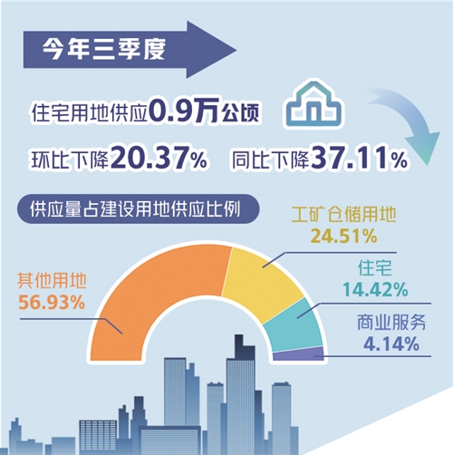 中國國土勘測規劃院新近發佈的全國主要城市地價監測報告顯示,三季度住宅用地供應0.9萬公頃,環比下降20.37%,同比下降37.11%,住宅用地供應同比增速為2015年以來單季最低。