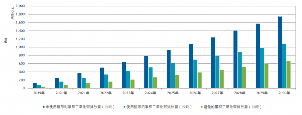 全球數據量逐年增加,也伴隨着CO2排放量的增加。對於降低碳排放量,磁帶也體現出優勢。市場研究權威IDC(International Data Corporation)預測,將要存儲在企業存儲系統上的80%的存檔數據以及要存儲在企業存儲系統上的57%的複製數據遷移到磁帶上後,每年的二氧化碳減排量將為43.7%,有可能在2019年至2030年期間避免累計6.64億公噸的碳排放。