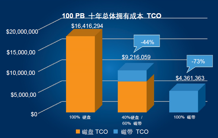將冷數據存儲在磁帶上也有着顯著的經濟效益。如在硬盤上保留十年100PB數據,白皮書預估總體擁有的成本TCO超過1600萬美元;而使用LTO 8磁帶介質和磁帶機的磁帶解決方案,TCO將降低70%以上。
