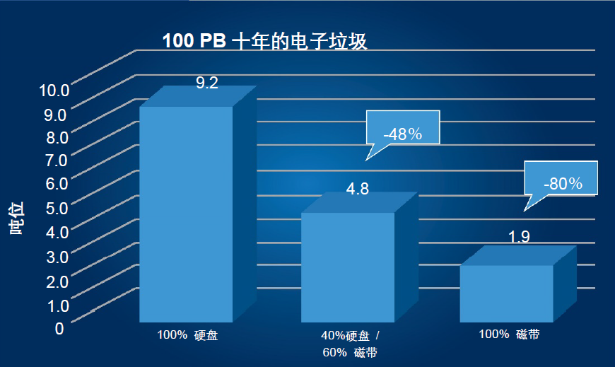 除了降低碳排放,將數據移動到磁帶上還將大大減少電子垃圾的數量。根據白皮書的計算,如果將100PB的數據保存十年,若全部存儲在硬盤上並考慮到硬盤5年後需進行更新,將產生9.2噸電子垃圾;若將60%的數據存儲在磁帶上,則只產生4.8噸電子垃圾;將所有數據保存在磁帶上,電子垃圾將降至1.9噸。
