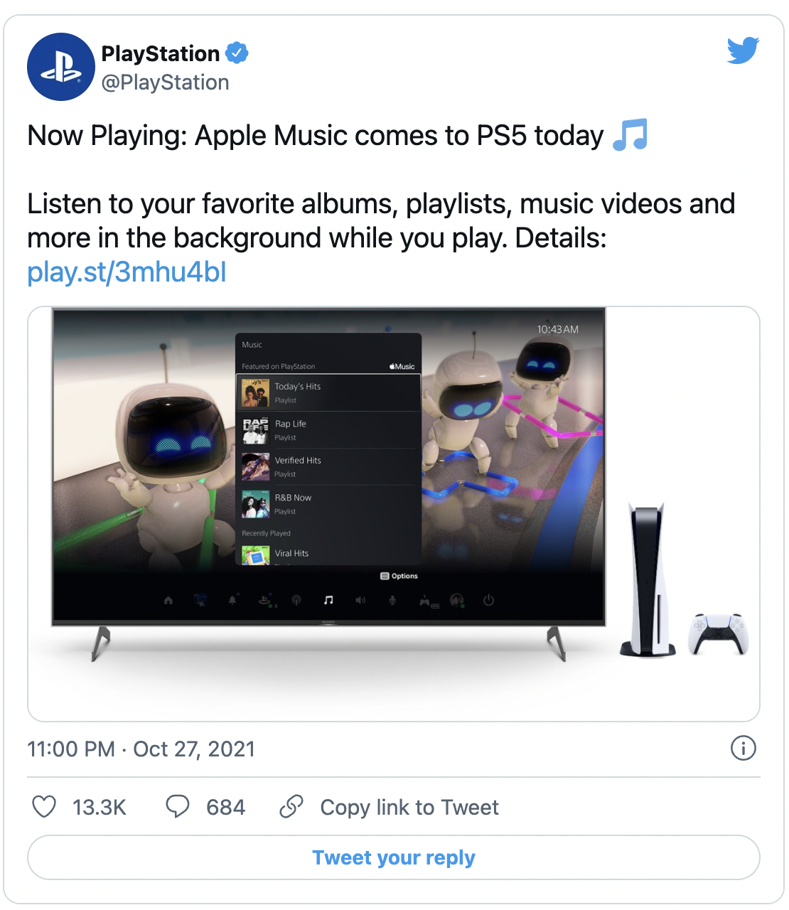 據悉,Apple Music可以讓Playstaion 5遊戲主機可以收聽超過9000萬首歌曲,同時還有各種歌單和廣播電台。Apple Music還支持播放音樂視頻,最高4K分辨率。用户可以讓Apple Music在後台播放,或者在遊戲中收聽。