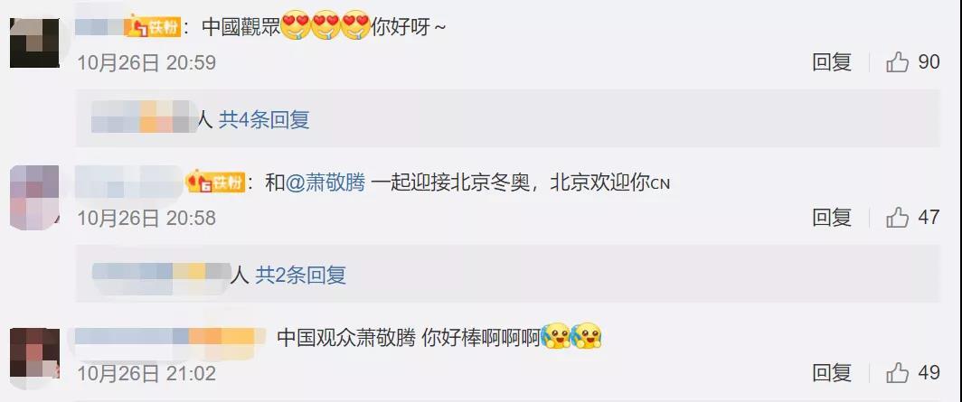 微博網友紛紛留言稱讚蕭敬騰:“你超棒的!為你驕傲”“北京歡迎你”……