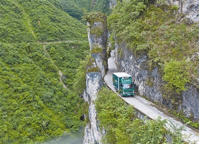 郵車行進在通往四川省漢源縣永利鄉古路村的懸崖山路上。