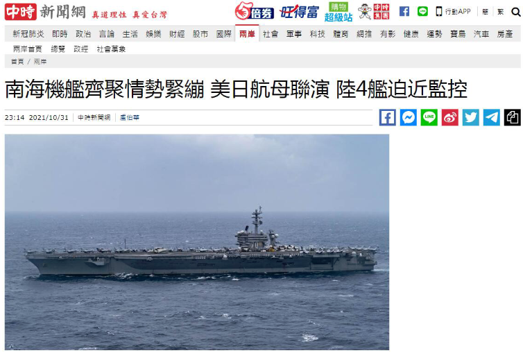 【環球網報道 記者 徐璐明】美日兩國航母目前正在南海勾結行動,連續多日開展聯合演習。台灣媒體也緊盯這一動向,報道稱衞星圖片顯示解放軍4艘艦船對美日航母近距離監控,其中一艘還可能是電子偵察船。