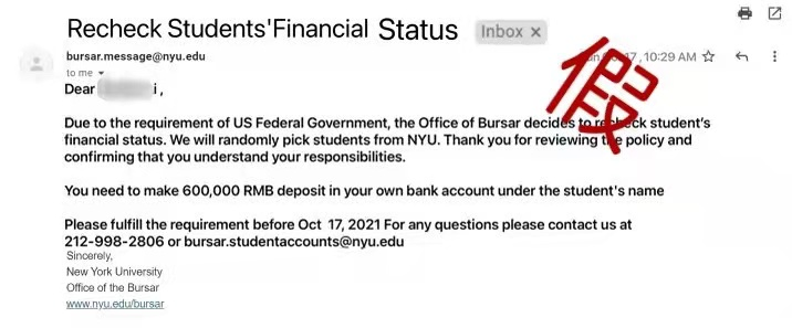 可昨前天孩子又來要錢,説接到學校郵件,要求在賬户里加存一筆錢,以證明學生自身經濟狀況。家長這次起了疑心,因為從未聽説美國學校還有這樣的要求,要求孩子把學校郵件轉來看看。沒過多久,孩子還真把學校郵件的截圖發過來了。