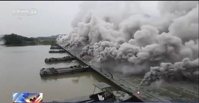 隨着浮橋的架通,岸上觀察員與各門橋長配合作業,迅速將浮橋校正,完成隱蔽偽裝。20餘台車輛裝備一次通過浮橋。