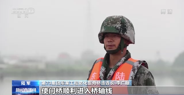 *第73集團軍某工程防化旅舟橋連連長 李廣順:*浮橋架設時通過汽艇牽引或頂推,使門橋順利進入橋軸線,再調整兩個浮橋段的距離,使浮橋能夠順利合龍。今天風浪比較大,對汽艇駕駛員來説,是比較具有挑戰性的。