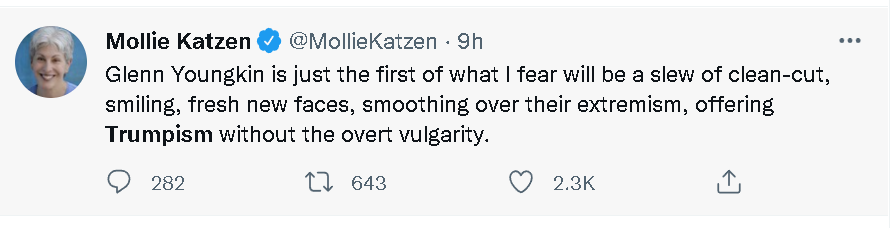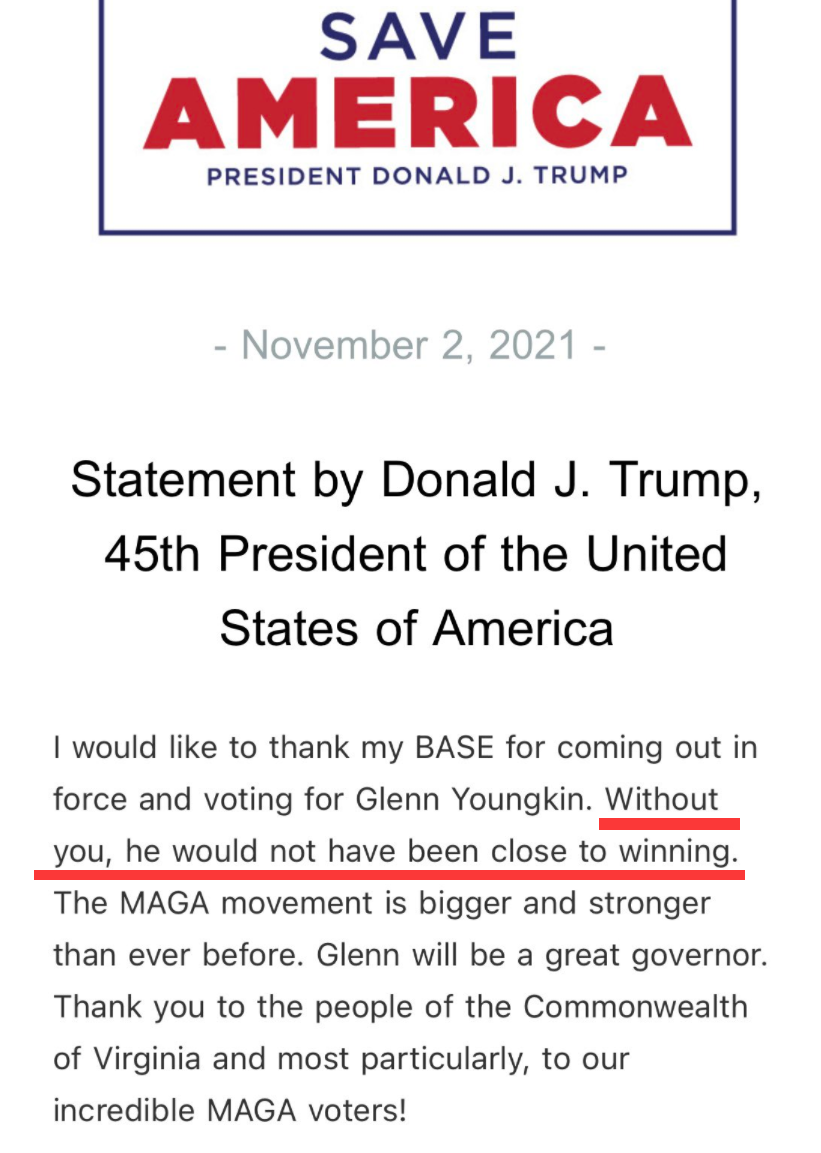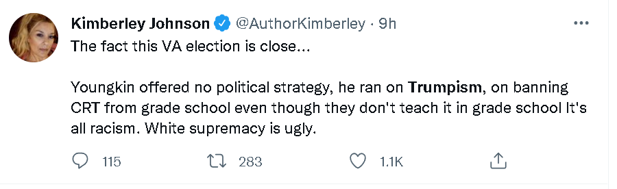 有民主黨的支持者還將他們失利的原因歸咎於敵人“太狡詐”,稱揚金能為共和黨贏得此次選舉是因為他“很會撒謊和煽動恐慌情緒”,尤其是把民主黨的反種族主義政策歪曲成是要在學校裏對美國兒童進行“洗腦教育”、以 “分裂美國族羣”、“打壓白人”、“宣傳馬列思想”和“改寫美國曆史”。