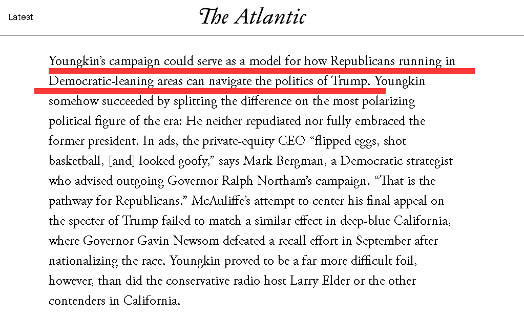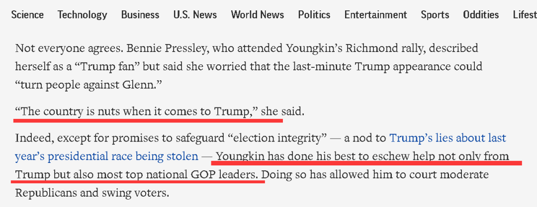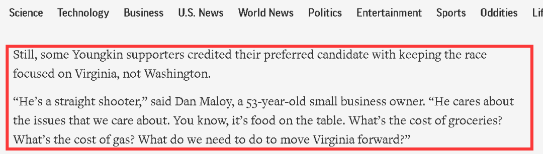 美聯社還介紹了弗吉尼亞州共和黨候選人揚金的表現,稱他在選舉時表現得更“務實”,比如更關心當地人的需求,而且揚金還知道如何一邊取悦特朗普的支持者,一邊又與特朗普保持距離,並稱這是他能贏得選舉的一個重點。