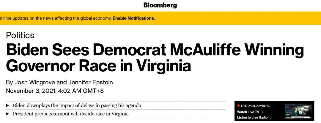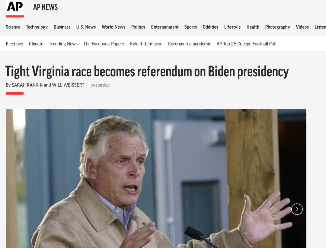 不過拋開這些調侃,弗吉尼亞州這場州長選舉對於美國明年的中期選舉乃至2024的總統選舉,確實還是有着較為直接的影響的。不少美國媒體也都承認這一關聯性,其中美聯社就在昨天刊文稱,這場選舉將是一次對拜登上台這1年表現的“公投”。