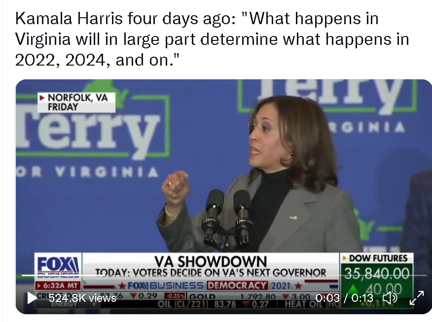 原來,就在幾天前,哈里斯為了給弗吉尼亞州民主黨籍候選人泰瑞·馬可利夫(Terry McAuliffe)助選,曾在後者的競選活動上強調説,此次州長選舉對美國的未來也有着重要的意義。