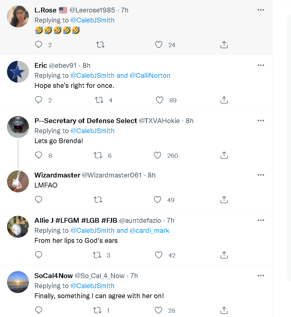 一些共和黨的支持者就諷刺她説,“這是我第一次認同她的話”,“確實,我們也很希望州長選舉的結果會影響到2022和2024的走向”,“希望她突出的話能進到上帝的耳朵裏”。