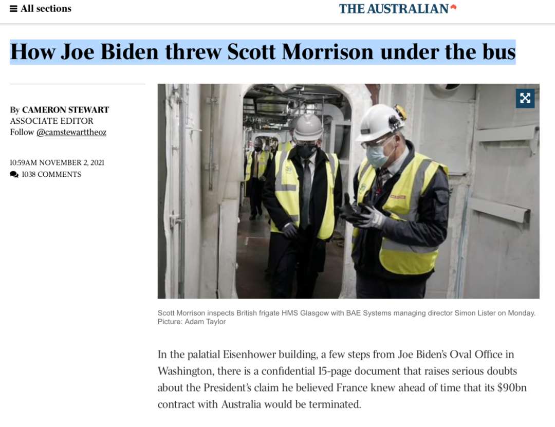 《澳大利亞人報》關於“拜登如何把莫里森當替罪羊”的報道截圖。