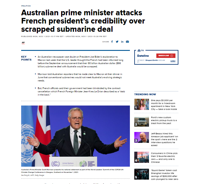 知情人士透露,在9月15日美英澳宣佈組建“奧庫斯”聯盟並簽署核潛艇合同兩天前,莫里森試圖給馬克龍打電話,但後者回短信説他不能接電話。
