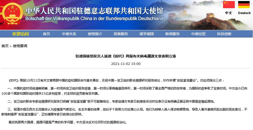 11月2日,駐德國使館發言人就德《時代》週報有關病毒溯源文章表明立場↓