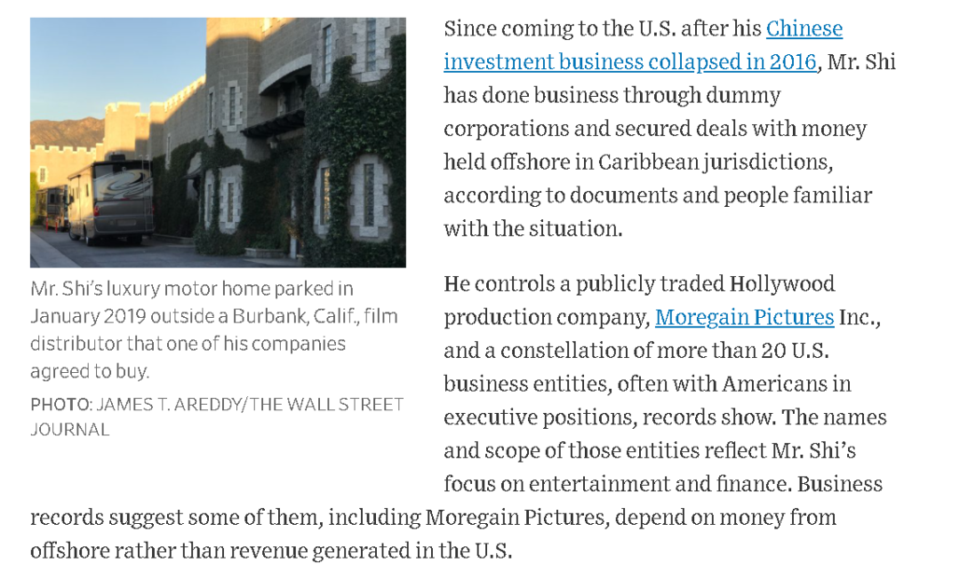 另外,華爾街日報還補充説,今年9月被美國美國證券交易委員還會停止了一切與施建祥在美國進行“投資”活動的那個好萊塢電影製作公司Moregain Pictures Inc有關的證券。