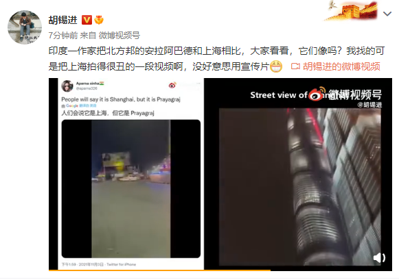 值得注意的是,微博下方配的這段視頻,正是這位印度女作家所拍印度城市街景和真正上海街景的對比,而上海這一視頻片段也並非官方宣傳片。胡錫進對此表示:“我找的可是把上海拍得很醜的一段視頻啊,沒好意思用宣傳片。”↓