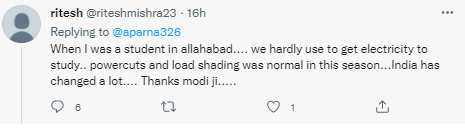“當我在安拉阿巴德上學的時候… 我們幾乎都沒有電用來學習… 停電在這個季節也很正常…(但)印度確實改變了許多… 感謝莫迪…”
