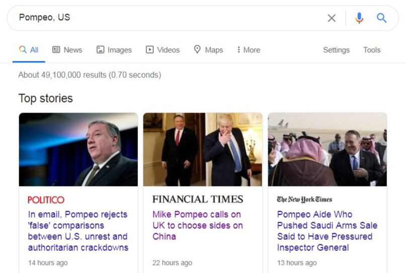 有人曾做過統計,如果在搜索引擎中輸入“蓬佩奧、美國”,搜索結果為4.41千萬條,而輸入“蓬佩奧、美國、中國”,搜索結果為3.4千萬條。