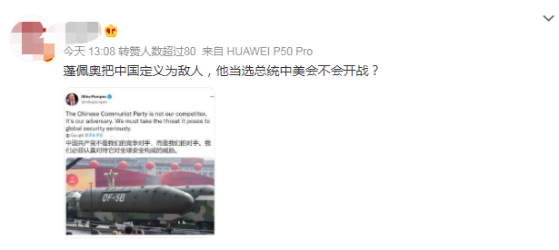 有網友表示,蓬佩奧把中國定義為敵人,他當選總統中美會不會開戰?