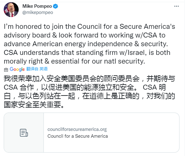 日前,蓬佩奧還宣佈他將加入安全美國委員會(The Council for a Secure America),這個號稱以保障美國能源安全為宗旨的智庫,其核心是捍衞《亞伯拉罕協議》的理念和加強與以色列的戰略聯盟。