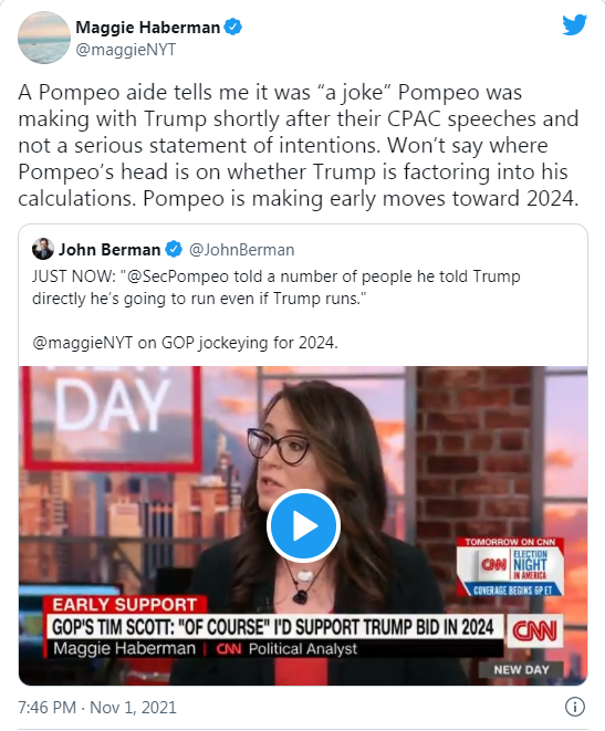 《紐約時報》的白宮記者、CNN的政治分析員麥吉·哈伯曼11月1日在節目中透露,蓬佩奧跟一些人説,他已經告訴特朗普他會參加2024年總統競選, 即使特朗普也會參與競選。