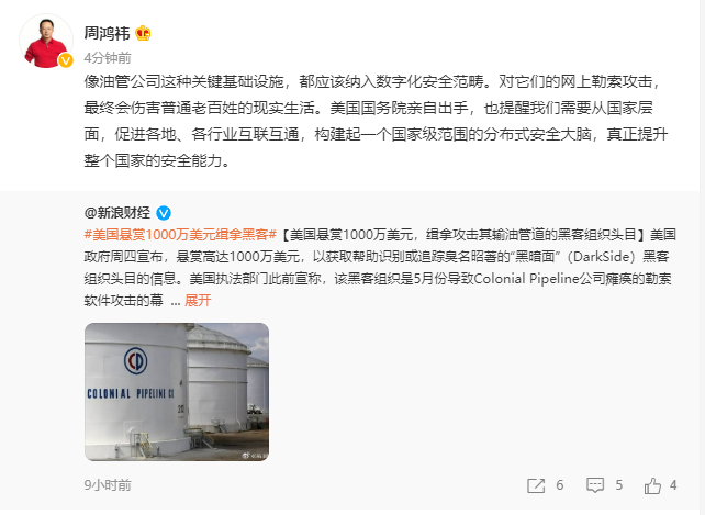 “美國國務院親自出手,也提醒我們需要從國家層面,促進各地、各行業互聯互通,構建起一個國家級範圍的分佈式安全大腦,真正提升整個國家的安全能力。” 11月5日下午,三六零(601360.SH,下稱“360”)集團創始人、董事長周鴻禕微博點評“美國懸賞1000萬美元緝拿黑客”事件。