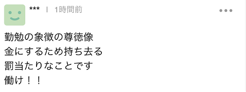 二宮金次郎在日本擁有較高知名度,事件受到日本網絡關注,多名日本網友對盜賊的行為進行了抨擊,有聲音批評稱,“二宮金次郎(負薪讀書)像被視為勤勉的象徵,為了賣錢拿走(銅像),會遭天譴。給我去工作!!”看到這起事件,還有人認為,“日本正在逐漸變化,我不認為是在向好的方向變。難道是要像這樣淪落下去嗎?”