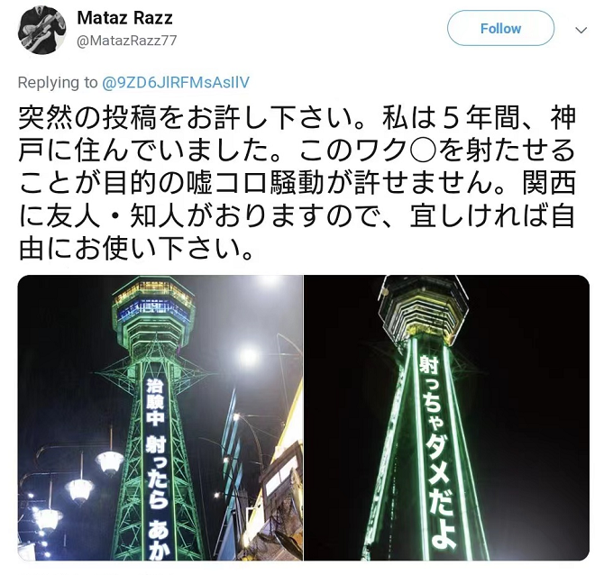 據報道,高井隆光接受採訪時稱,這些圖片從本月3日開始在日本推特和Instagram社交媒體上流傳,圖片中通天閣的霓虹燈廣告被P成了“打(疫苗)可不行哦”、“臨牀試驗階段,打了可不行”這種被視為反疫苗的語句。