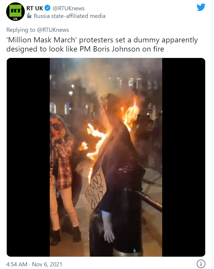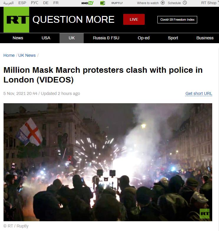 報道稱,抗議者當天在倫敦的議會廣場、特拉法加廣場和牛津街遊行,紀念每年11月5日舉行的“百萬面具遊行”。RT説,每年的這一遊行都會引發大規模示威活動,參與者抗議政府越權、收入不平等,今年的示威者還抗議最近新出台的新冠疫情限制措施。