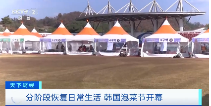 *財經頻道特約記者 劉崢:*我現在在韓國槐山郡泡菜節的現場,在户外運動場上,我們可以看到圍繞着跑道設置了有40多頂透明的帳篷,這裏就是大家制作泡菜的體驗空間。