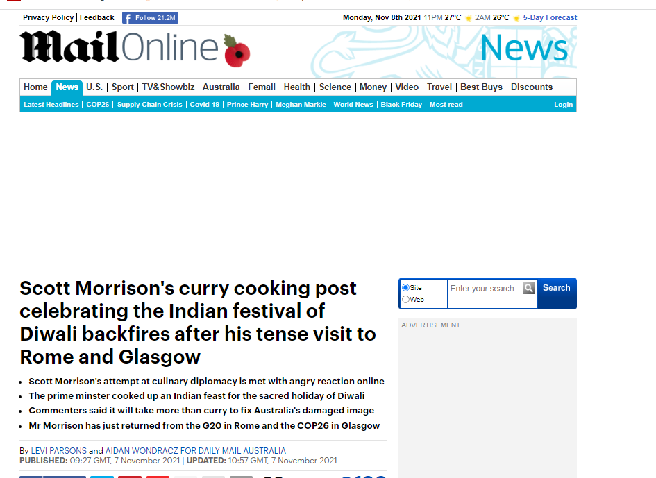 英國《每日郵報》7日消息稱,正值印度傳統排燈節,澳大利亞總理莫里森上週下廚做了幾道咖喱,沒想到在社交媒體上“引起轟動”,有網友毫不客氣地批評莫里森在國際舞台上的“羞恥”表現。