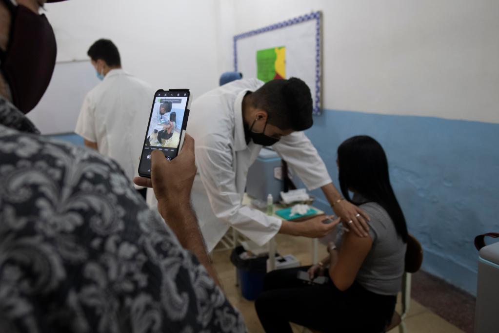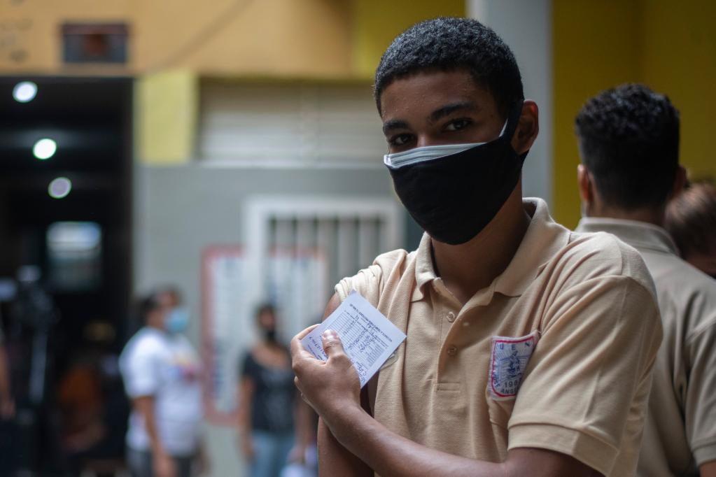 11月4日,在位於委內瑞拉首都市中心的“何塞·安潔爾·阿拉莫”中學,一名學生們在接種中國疫苗。薩爾戈多攝