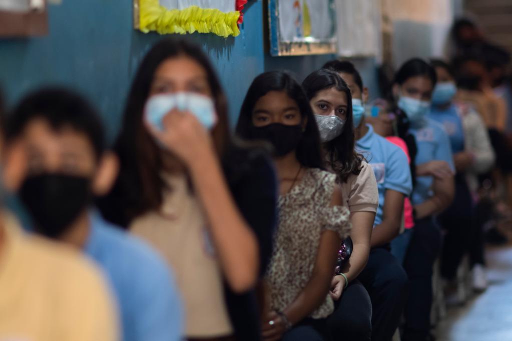 11月4日,在位於委內瑞拉首都市中心的“何塞·安潔爾·阿拉莫”中學,學生們在排隊接種中國疫苗。薩爾戈多攝