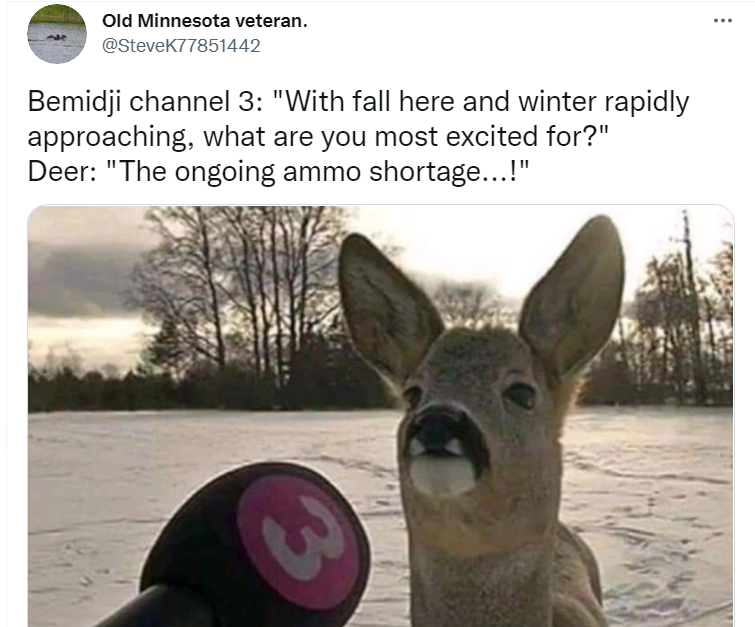 得知這個消息後,不少飽受供應鏈問題困擾的美國網民紛紛表示:“我們美國缺啥都正常,咋連子彈都缺呢?”由於秋冬季節是不少美國人持槍打獵的時候,還有美國網民做了下面這個“採訪獵物感謝”的表情包,調侃起了這個事情。