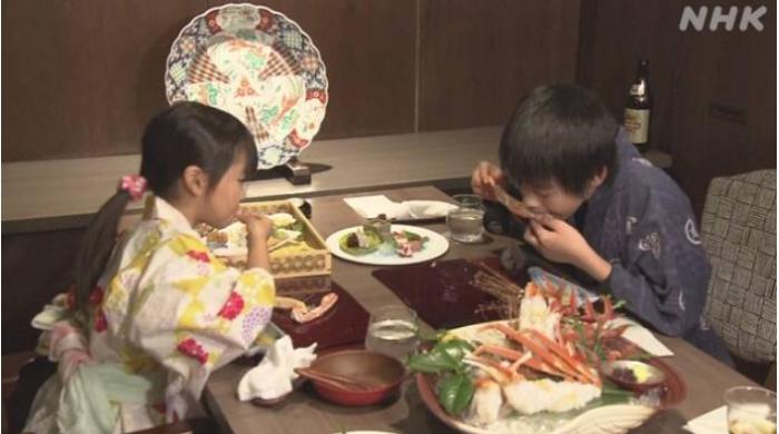 金澤市的一家四口得到免費品嚐價值500萬日元帝王蟹的機會。圖為兩個孩子正在食用帝王蟹。圖片來源:日本放送協會(NHK)報道截圖。