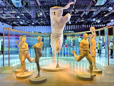 進博會阿迪達斯展台入口處的“全民健身,一起更強”主題雕塑。光明日報記者 曹元龍攝/光明圖片