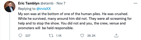 我兒子就是其中一個被人羣壓在下面的人,這次他僥倖逃脱了,但他身邊的很多人並沒有逃掉。所有的人都在高呼救命,停止演出,但你並沒有那麼做。你和你的團隊都要對此負責。